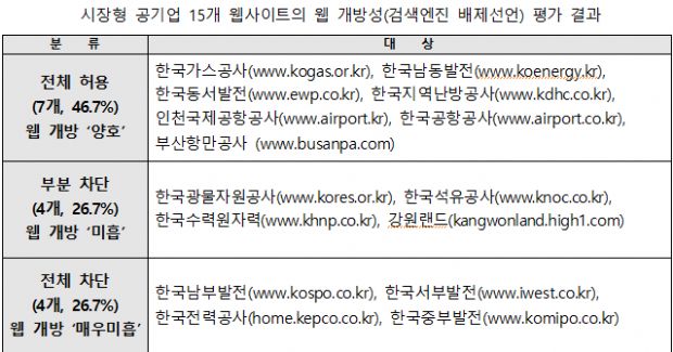 반면 한국광물자원공사와 한국석유공사, 한국수력원자력, 강원랜드 등 4곳은 웹사이트 검색(접근)을 부분적으로 차단해 웹 개방이 미흡한 것으로 조사됐다. 또 한국남부발전, 한국서부발전, 한국전력공사, 한국중부발전 등 4곳은