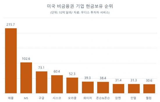 기업별로는 애플이 2천157억 달러로 현금 보유고 1위를 기록한 가운데 MS(1천260억 달러)와 구글(731억 달러)이 그 뒤를 이엇다.