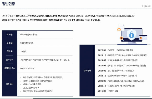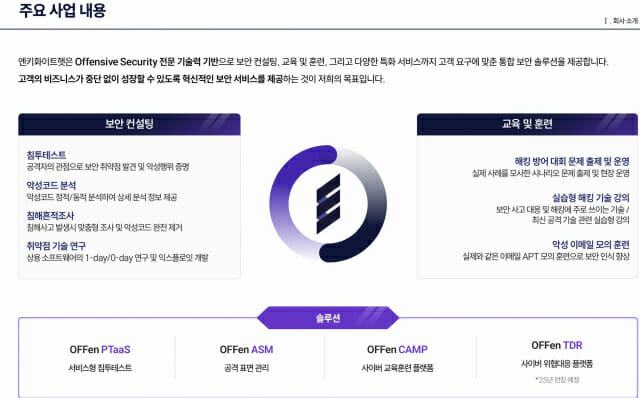 "국내 공격형(오펜시브) 보안시장은 아직 초기 단계입니다. 엔키화이트햇은 모의 해킹과 취약점 분석에서 국내서 독보적인 경험과 기술력을 기반으로 시장을 선도하고 있습니다."
