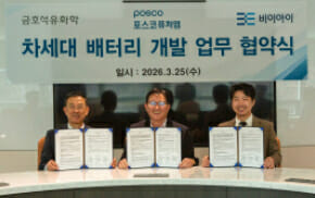 소재·양극재·셀 설계 기업들이 손잡고 무음극 리튬메탈 배터리 상용화에 속도를 낸다. 금호석유화학은 25일 포스코퓨처엠, 비이아이(BEI)와 차세대 배터리 기술 협력을 위한 3자...