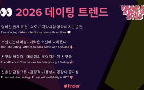 틴더가 올해 전 세계 틴더 이용자들 사이에서 가장 주목할 만한 데이팅 트렌드를 조명한 연말결산을 3일 발표했다. ‘Year in Swipe’는 틴더 데이터를 기반으로 앱 내 인기 관심사와 MBTI, ‘패스포트’ 기능으로 가장 많이 방문하는 나라 등 한 해 동안의 연애 및 데이트 관련 다양한 이용자 트렌드를 살펴본다. 틴더는 전 세계 이용자 데이터 분석을 통해, MZ세대 싱글...