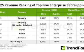 기업용 SSD(eSSD) 시장이 인공지능(AI) 데이터센터 투자 확대로 시장 규모가 크게 성장했다. 특히 삼성전자가 선두자리를 공고히 한 것으로 나타났다.5일(현지시간) 시장조사업체 트렌드포스에 따르면 올 3분기 데이터센터에 탑재되는 eSSD 매출액은 65억4천만 달러(약 9조6천300억원)로 전분기 대비 28% 증가했다.이같은 호조세는 공급과 수요 측면 모두에서 기인했다. 현재 전...