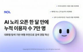 놀유니버스가 운영하는 NOL은 인공지능(AI) 기반 대화형 탐색 서비스 'AI 노리' 출시 한 달 만에 누적 이용자 수 7만 명을 돌파했다고 22일 밝혔다.지난달 첫선을 보인 AI 노리는 이용자의 질문 의도와 맥락을 이해해 국내 숙소 및 레저 상품을 대화 형태로 추천하는 서비스다. AI 노리는 NOL 검색창 하단이나 검색 결과 화면에 노출되는 플로팅 아이콘을 통해 이용할 수 있...