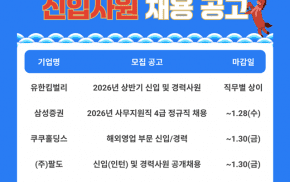 인크루트는 새해 취업을 목표로 세운 구직자들을 위해 ▲유한킴벌리 ▲삼성증권 ▲쿠쿠홀딩스 ▲팔도가 채용 공고를 올렸다고 23일 밝혔다. 유한킴벌리는 2026년 상반기 신입 및 경력사원을 채용 중으로, 신입이 지원할 수 있는 직무는 ▲기업 간 거래(B2B) 마케팅 ▲가정용품(티슈) 마케팅 ▲SCM 혁신 프로덕션 플래너다. ▲B2B 마케팅 ▲가정용품(티슈) 마케팅의 근무지는 서울...