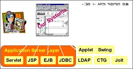 ④ 네번째 계층 : 마지막 계층은 제품의 API 계층입니다. BEA 웹로직·IBM 웹스피어·서블릿·JSP·RM·EJB API 등등 산업계에서 제공되는 API 계층입니다.