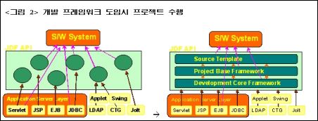 이러한 샌프란시스코 프레임워크와 .NET 프레임워크는 정형화된 업무를 위한 비즈니스 컴포넌트를 미리 만들어두고, 이를 조립함으로써 생산성을 극대화하자는 것이 요지입니다. 현재의 프레임워크란 것은 '기반 틀 구조' 라는 모호한 추상적인 개념 보다는 물리적인 실체이면서 반 제품 성격의 구체적이고 체계화된 API를 제공하는 개념에 더 가깝습니다.