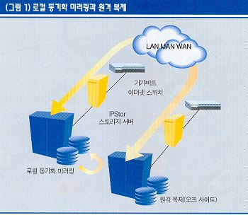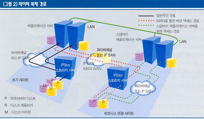 스토리지 서비스의 기능 구현 IP에서 데이터를 원거리로 이동시켜야 하는 경우에도 스토리지 네트워크 기반의 복제는 기업의 규모가 크건 작건 비용 측면에서 효율적인 재난 복구 솔루션이다. 이 방식은 어떤 DR 시나리오도 수용할 수 있도록 포괄적인 데이터 보호 기능을 제공하기 때문에, 스토리지 크기나 종류에 상관없이 탁월한 접근방식이다.기존 스토리지 가상화 제품은 현재 사용하는 스토리지의 데이터를 일단 다른 저장소로 이동시키고 가상화 작업을 거친 후, 다시 데이터를 옮겨야 하는 단점을 가지고 있었다. 스토리지 데이터를 복제하는데는 별도의 하드웨어를 필요로 하지 않기 때문에 LAN, MAN, WAN 등 기존의 어떤 네트워크 인프라에서도 문제없다. 이런 데이터 복제는 애플리케이션 서버와는 독립적으로 구성 관리되므로, 애플리케이션 서버는 백업 사이트에 데이터를 복제하는 것을 전혀 알 수 없으며 아무런 영향도 받지 않는다. 통합된 스냅샷 엔진은 메인 사이트에서 백업 사이트로 데이터를 이동하는 동안 복제된 데이터가 손상되지 않도록 설계됐다. 만약 복제하는 동안 문제가 발생하면 복제된 데이터는 디스크에 저장되지 않는다. 애플리케이션을 감지하는 스냅샷 에이전트를 이용해 실제 데이터베이스가 데이터 무결성과 포인트 인 타임 일관성을 유지하면서 데이터를 복제할 수 있다.복제 채널을 형성하기 위해 메인 사이트의 어플라이언스는 백업 사이트의 어플라이언스와 통신한다. 초기 동기화 프로세스는 메인 사이트에서 복제 사이트로 데이터를 전송하기 위해 일어난다. 데이터 크기가 큰 경우에는 이와는 다른 방법을 적용한다. 일단 동기화 작업이 끝난 후에는 변경된 데이터만이 전송된다. 대용량 데이터에 대해서는 초기 동기화 작업에 어려움이 따른다. 예를 들어, 상대적으로 속도가 빠르지 못한 WAN 환경(T1을 예를 들면 481GB/월 정도로, 1TB 데이터를 전송하는데 약 2달 이상이 소요)에서 테라바이트의 데이터를 전송하는 데 제약이 있을 수 있다. 그러나 매일 변경된 데이터는 크지 않기 때문에 WAN으로 충분히 전송할 수 있을 것이다. 문제는 처음에 대량의 데이터를 어떻게 전송하는가에 있다. 이런 문제를 해결할 수 있는 방법으로 델타 동기(Delta-Synch) 방식이 있다. 데이터를 전부 복사할 필요없이 동기화 전에 어떤 데이터를 복제해야 하는지 결정하기 위해 양쪽의 데이터를 먼저 비교한다. 따라서 원격 사이트에 대량의 초기 데이터를 전송할 수만 있다면, 델타 동기 방식을 통해 변경된 부분만을 동기화하면 된다. 대량의 데이터를 옮기는 방법으로는 크게 다음과 같은 2가지 방법이 있다. 첫째, 메인 사이트에서 미러 볼륨을 생성하는 것이다. 먼저 복제 사이트에서 사용할 저장 매체를 메인 사이트에 설치한다. 이는 개별 어레이일 수도 있고, 비슷한 종류의 어레이로부터 제거 가능한 드라이브일 수도 있다. 설치한 저장 매체에 드라이브의 데이터를 동기화한다. 물론 이 과정은 한 사이트에서 이뤄지기 때문에 WAN 연결을 필요로 하지 않는다. 그 다음 복제 사이트에 설치한다. 두 개의 데이터 볼륨을 비교해 미러링 이후의 변경된 데이터만을 모아 이를 복제한다. 데이터 전체가 아닌 하루나 이틀 동안 변경된 데이터만을 복제하기 때문에 WAN의 부하를 줄이고 대역폭 비용을 절감할 수 있다.이와 비슷한 방식으로 테이프 백업을 이용할 수도 있다. 먼저 고속 백업방식인 제로 임팩트 백업을 통해 메인 사이트에 있는 데이터를 백업한 후, 백업한 데이터를 복제 사이트에 복구한다. 앞에서 설명한 것과 마찬가지로 양쪽의 데이터 볼륨을 비교해 백업 이후의 변경된 데이터에 대해서만 동기화가 이뤄진다. 메인 사이트의 스토리지에 문제가 발생하면 손상된 데이터 대신에 IP로 연결된 복제 데이터를 바로 사용할 수 있다. 복제 프로세스의 포인트 인 타임 일관성과 트랜잭션 무결성이 유지돼, 손상된 데이터를 대신해 사용되는 복제 데이터는 데이터베이스 일관성 체크와 같이 시간이 많이 소요되는 작업은 할 필요가 없다. 복제 정책시스템 관리자는 각 데이터 볼륨에 대해 개별적인 복제 정책을 유연성 있게 세울 수 있다. 시스템 관리자는 데이터 볼륨에 대해 자사의 환경에 맞는 복제 정책을 마련하기 위해 다음과 같은 사항을 설정할 수 있다. ·데이터 변경량 / Amount of Data Change (예 : 1MB)·시간 / Time of Day (예 : 11:30 PM)·간격 / Time interval (예 : 2분 간격) 예를 들어, 어떤 데이터 볼륨은 매일 밤 10시에 복제하고, 다른 어떤 데이터 볼륨은 5분마다 복제하도록 관리자가 자유롭게 설정할 수 있다. 또 다른 어떤 데이터 볼륨에 대해서는 마지막 복제 이후 변경된 데이터 양이 1MB가 되면 복제를 시작하도록 설정할 수도 있다. 데이터 볼륨에 대해 각각의 이상적인 복제 정책이 정해지면, 결정된 복제 정책에 따라 자동적으로 복제 프로세스를 수행한다. 트랜잭션 무결성과 포인트 인 타임 일관성데이터 복구시 백업이 유효하려면 데이터베이스의 트랜잭션 무결성과 포인트 인 타임 일관성은 더욱 중요하다. 만일 백업 데이터가 원본 데이터와 정확하게 일치하지 않으면, 결과적으로 서비스하는