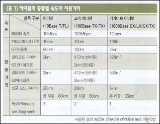슈마 : 당연하지. 장애가 생겼다고 가 봤는데 케이블이 빠져 있으면 정말 허탈하지. 케이블은 네트워크 장비와 장비를 연결하는데 필요한 장치로, 사람 몸에 비유하면 신경조직과 같다고 할 수 있지. 케이블은 지원 속도와 거리에 따른 여러 종류로 구분할 수 있어(표 1).