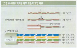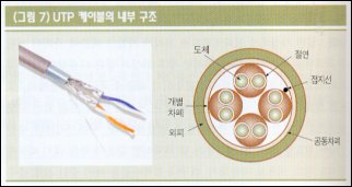 슈마 : 일반 가정에서 전화국까지는 거리가 가깝기 때문에 가격이 저렴한 구리선을 주로 사용하지. 하지만 향후 화상과 같은 대용량의 정보 전달이 필요할 경우, 고속 전송이 필수이기 때문에 최근에는 광케이블로 이를 대체하고 있어. 국가와 국가 간에는 거리도 멀고, 사용 회선 수도 많으므로 구리선 보다는 광케이블로 연결하게 돼. 구리선이라면 수만 가닥이 필요할 것이, 광 케이블은 몇 가닥이면 같은 용량을 내기 때문에 공사도 쉽고, 비용도 저렴하지. 더구나 광케이블을 써야 중간 신호 증폭을 하는 중계 장비도 적게 설치할 수 있어. 자, 이제부터는 LAN에서 가장 많이 사용하고 있는 UTP 케이블에 대해 알아볼까. UTP가 무슨 뜻인지 알고 있나?