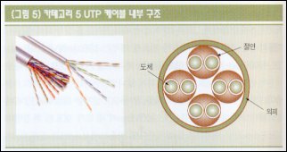 슈마 : 선끼리 수평으로 있으면 전기적인 영향이 생겨 데이터 전송률이 떨어지는 문제가 발생할 수 있어. 이런 장애를 없애기 위해 꼬아 놓은 것이지. 속도가 빠를수록 꼬임수도 많은데 10Mbps 속도의 카테고리 3는 12인치(1피트)당 3∼4회 정도 꼬였고, 100Mbps 속도의 카테고리 5는 1인치당 3∼4회로, 더 많이 꼬여 있지.