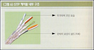 슈마 : 음, 많이 알고 있군. 덧붙인다면 (그림 6)과 같이 STP 케이블은 은박지와 같은 것이 외부의 전기적인 잡음으로부터 케이블을 보호하고 있기 때문에 변전소 등 전기적인 특성이 강한 특수한 곳에서 많이 사용하고 있어. 일반 빌딩, 건물 사무실은 대부분 UTP 케이블을 사용하지.