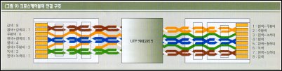 슈마 : 그렇지. UTP는 총 8가닥으로 구성돼 있는데, 파란색, 오렌지색, 그린색, 갈색의 4가지 기본 색상과 이들과 각각 쌍을 이루는 4가닥의 흰색 선이 있지. 단색 8색상보다 2가닥씩 꼬인선 간에 혼합으로 된 것이 작업하기가 수월해. 스트레이트 케이블 작업시에는 UTP 8가지 색상을 표준에 따라 RJ-45 커넥터에 핀(PIN) 배열 구성을 해야 돼.