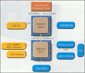 DDR SDRAM을 사용하는 인텔의 주력 칩셋은 펜티엄 4 플랫폼인 i845 계열이다. 시장에 유통되고 있는 최신 칩셋은 i845PE와 i845 GE 칩셋인데, 두 칩셋은 그래픽 코어의 내장 유무만 다를 뿐 기본적인 기능은 유사하다. 이 중에서 i845PE 칩셋은 i845E 칩셋의 뒤를 잇는 제품이다. i845PE 칩셋은 82845PE MCH(Memory Controller Hub)와 82801DB ICH4(I/O Controller Hub)로 이루어져 있으며, 기존 i845E 칩셋과의 차이점은 DDR 333 메모리와 펜티엄 4의 새로운 기능인 하이퍼쓰레딩을 지원한다는 것이다. 당초 예상했던 667MHz FSB 지원 여부는 인텔 내부적으로 667MHz FSB를 취소하고 곧바로 800MHz FSB를 적용한다는 방침에 따라 533MHz FSB까지만 지원한다.