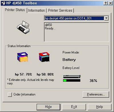 설치 후 프린터의 모든 상황은 ‘HP Deskjet 450 Toolbox’에서 한눈에 알아볼 수 있다. 그러나 이 툴박스가 최소화 되었을 경우 아이콘을 통해 배터리 잔량을 표시해 주었으면 더욱 좋았을 것이다.