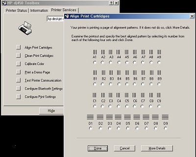 툴박스의 기능들을 유심히 살펴보면 ‘프린터 서비스’라는 탭이 있다. 이곳에서는 프린터의 카트리지 청소부터 색감조절 등등이 가능하다. 특히 ‘얼라인 프린터 카트리지’ 기능은 처음 구입 후 반드시 실행해야 한다. 얼라인을 실행하면 한 장이 출력되어 나오는데 이중 가장 선이 똑바르게 나온 것을 골라 팝업창에서 체크해 주면된다.