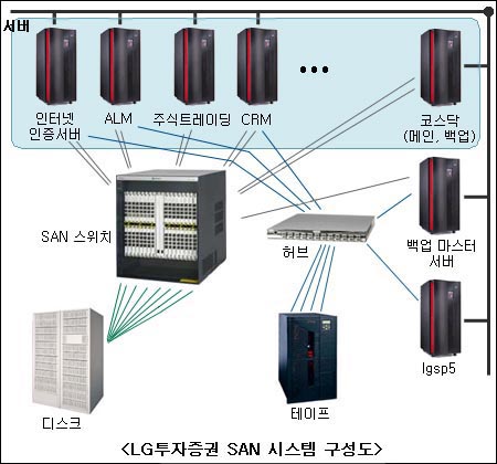 BC카드와 같은 듀얼 SAN 스위치 시스템은 스위치 한대가 장애를 일으켜도 다른 한대로 전체 데이터에 대한 액세스를 계속 유지할 수 있다는 장점이 있어 BC카드 외에도 많은 금융업체와 대기업들이 채택하고 있는 방식이다.BC카드의 경우 SAN 시스템 구축 후 3개월의 조율기간 동안 기존 SCSI 시스템을 병행 운영했으며 이후 큰 문제없이 완전한 SAN 환경으로 전환할 수 있었다. 허진영 팀장은 SAN을 도입한 이후 얻은 가장 큰 효과로 ▲원활한 시스템 운영 ▲스토리지 가용성 증대 ▲스토리지 증설에 따른 물리적 제약 극복 ▲관리의 용이함 ▲향후 재해복구 시스템 구축을 위한 기반 마련 등을 꼽았다. 특히 스토리지단의 지능형 부하분산 기능이 수동으로 직접 부하를 분산시켰던 작업을 자동으로 대체함으로써 인력 활용 효율이 높아졌으며, 장기적으로 인력증강 필요성을 억제해 인건비 감축 효과도 예상된다고 허진영 팀장은 전했다.한편 BC카드는 당초 계획에 따라 SAN을 기반으로 한 원거리 재해복구 시스템을 구축할 방침으로 현재 기획안이 이사회의 최종 의사결정을 기다리고 있다. 내부적으로 결정이 내려지면 바로 프로젝트를 발주해 이르면 올해 말, 늦어도 내년 초까지는 구축을 완료한다는 방침이다. LG투자증권의 전체적인 IT 인프라 규모는 동종업계 평균의 1/3 수준이다. SAN 스위치도 금융권에서는 보기 드물게 1대만 도입했다. 일반적으로 금융권과 대기업이 듀얼, 많게는 4-웨이 SAN 스위치 시스템을 구축하는 것과 비교하면 다소 예외의 경우라고 할 수 있다. 이와 관련 LG투자증권측은 “IT 인프라 규모가 작은 것은 시스템 구축시 효율성을 우선 강조해온 결과며, SAN 스위치 경우에도 장비를 검증한 결과 1대로도 충분히 요구되는 안정성을 확보할 수 있다고 판단했다”고 밝혔다.LG투자증권이 도입한 엔터프라이즈급 SAN 스위치는 듀얼 채널을 지원, 어느정도 선까지는 스스로 장애에 대처할 수 있는게 사실이다. 하지만 심각한 장애가 발생할 경우를 대비해 LG투자증권측도 향후 듀얼 스위치 시스템으로 확장시킬 계획이다.LG투자증권이 SAN 시스템을 도입한 궁극적인 목적은 원거리 재해복구 시스템을 구축하기 위해서다. 재해발생시 복구를 위한 백업센터는 본사 전산시스템이 위치한 서울 송파구 방이동에서 약 10km 떨어진 강남구 논현동에 위치하고 있으며 DWDM망을 통해 실시간으로 데이터가 미러링 되고있다.SAN 시스템은 2002년 4월 구축해 3개월간의 조정을 거쳐 7월부터 정식 가동에 들어갔다. LG투자증권 시스템운영팀 손홍 차장은 “이 기간은 대부분 서버 운영체제 업그레이드에 소요됐으며 SAN 스위치와 관련해서는 별다른 변경사항이 없었다. 초기에 디스크 단에서 드라이버와 백업 시스템간에 충돌이 있었으나 심각한 문제는 아니었다”고 전했다.LG투자증권의 기존 서버 운영체제는 94년부터 사용한 썬 솔라리스 2.5.1 버전이었다. 업그레이드 시기가 지났지만 애플리케이션 포팅을 비롯한 신뢰성 문제로 계속 사용해온 것이다. 하지만 2.5.1 버전은 2GB 이상의 파일 시스템을 생성하지 못한다는 제약이 있어 결국 SAN 시스템을 구축하면서 운영체제도 솔라리스 8로 업그레이드 했다. 손홍 차장은 “SAN 시스템 구축에서 가장 오랜 시간이 걸리고 어려웠던 것은 사실 SAN과 직접적인 연관이 없는 서버 운영체제 업그레이드와 이에 따르는 애플리케이션 포팅 작업이었다”고 말했다.[IT 활용현장] ⑧ KMS - 포스코·유니모테크놀로지[IT 활용현장] ⑦ 윈도우 서버 2003 - 대림산업·부산대학교[IT 활용현장] ⑥ 매니지드 서비스 - 아카데미 과학·하나코비[IT 활용현장] ⑤ 클러스터링 - 호스트웨이·스카니아[IT 활용현장] ④ IT 아웃소싱 - UNDP[IT 활용현장] ③ 중소기업용 ERP - 휴맥스·크린앤사이언스[IT 활용현장] ② IP텔레포니 - 에어프로덕트 & 케미칼[IT 활용현장] ① SAN - BC카드·LG투자증권증권사로서 SAN을 구축한 이후 거둔 가장 큰 효과는 실시간 장애대응과 재해복구 기능이다. 주식, 선물 등의 거래는 분초를 다투기 때문에 이러한 실시간 복구는 사실 필수적인 것이라고 할 수 있다. 기존에는 예기치 못한 장애가 발생할 경우 복구에 몇시간씩 소요되기도 했으나 SAN 시스템을 구축한 이후부터는 어싱크(async) 방식으로 실시간 미러링이 이뤄지기 때문에 최장 5분 이내에 서비스 복구가 가능해졌다.