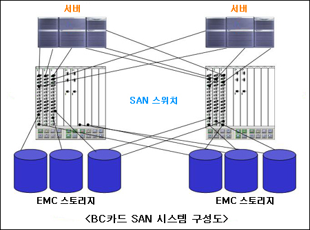 SAN(Storage Area Network)은 직접 부착되는 기존의 DAS(Direct Attached Storage) 방식을 대체하면서 기업 스토리지 설계와 구현, 관리 방법을 크게 바꿔놓고 있는 기술이다. SAN 시스템은 스토리지를 효율적으로 통합함으로써 가용성을 높이고 지능화된 관리 기능을 구현한다. 또한 원거리 재해복구 시스템 및 실시간 장애대응 시스템을 구축할 수 있는 기반 기술로써 재난발생시 기업 데이터 보존·서비스 유지 측면에서도 주목받고 있다.국내에서 SAN에 대한 관심은 지난 2000년부터 금융권을 중심으로 급격히 확산됐다. 특히 IMF 이후 정부가 경기부양 정책으로 신용카드와 주식시장을 적극 활성화시키면서 거래량이 폭증한 증권사와 카드사 등이 국내 SAN 도입 초창기를 이끌었다고 할 수 있다. 이후 2002년까지 큰 폭의 성장세를 구가하던 국내 SAN 시장은 대기업과 금융권 수요가 정점을 지나고 경기가 위축되면서 올해 들어 잠시 주춤한 상태다. 하지만 향후 1차 도입한 기업들의 추가 수요가 꾸준히 발생할 전망인데다 공공기관, 중소기업 등 신규시장 개척 여지가 남아있어 관련업체들의 시장 공략도 여전히 활발하게 펼쳐지고 있다. 특히 초창기 SAN 도입 기업들의 기대효과 달성 여부가 구체적으로 드러날 시기가 되면서 장단기적으로 SAN 도입을 고려하고 있는 여타 기업들의 관심이 모아지고 있다. BC카드는 4개 시중은행(조흥, 제일, 한미, 하나)과 3개 특수은행(기업, 국민, 농협), 3개 지방은행(대구, 부산, 경남) 및 1개 전업카드사(우리신용카드)를 회원사로 두고 회원사의 신용카드회원 관리와 가맹점 신용카드 이용을 안정적으로 뒷받침 해주는 것을 주된 업무로 하고있다. 1994년 BC카드 회원은 800만명 수준이었으나 2001년 1500만명, 2002년 2000만명을 돌파했으며 연간 거래액이 60조원에 이르는 등 2000년대 들어서 가파른 성장세를 기록했다. 정부의 신용카드 사용 권장 정책으로 회원·거래량이 폭증하자 BC카드는 이를 효율적으로 처리하기 위해 서버 및 스토리지 업그레이드를 진행했으며 그 일환으로 2002년 하반기 SAN 시스템을 구축했다.당시 프로젝트 실무를 담당한 BC카드 허진영 팀장은 “BC카드의 OPS(Oracle Parallel Server) 환경에서는 시스템 성능이 뒷받침되지 않으면 자원 로킹 현상이 발생, 데이터 릴리즈 시간이 지연된다. 이는 실시간으로 거래 트랜잭션을 처리해야 하는 카드사 시스템에서는 심각한 문제발생의 소지가 있었다”며 “거래량이 급격히 늘어나는 상황에서 파이버 채널(FC) SAN 시스템은 기존 SCSI의 40Mbps보다 훨씬 빠른 100Mbps의 대역폭을 제공할 뿐 아니라 스토리지단의 버퍼캐시를 통한 지능적인 부하분산이 가능해 데이터 입출력 부하를 효율적으로 관리할 수 있어 적극 도입을 추진했다”고 밝혔다. BC카드는 2대의 SAN 스위치에 HP 알파서버 GS320과 ES40 각각 4대를 EMC 8830 스토리지 시스템과 연결시켜 SAN 환경을 구현했다.