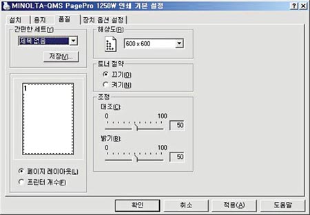 프린터 위에 LCD 패널이 없어 기본 설정과 인쇄질, 크기 등을 윈도우즈 제어판에서