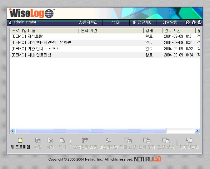 따라서 분석 프로파일과 분석 대상 웹로그만 따로 관리하는 것이 가능하며 제품을 새로 설치했을 때도 이전의 분석 설정 내용을 손쉽게 복구할 수 있다. 더구나 여러 개의 프로파일을 관리할 수 있기 때문에 여러 관점에서의 분석이 가능하고 와이즈로그 프리미엄 하나로 서로 다른 여러 웹 사이트를 분석할 수도 있다.
