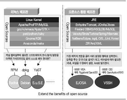 <그림 2>는 필자가 생각하고 있는 J2EE 기반 기술을 위한 오픈소스 통합 배포판의 개념을 정리한 것이다. 우선 다양한 오픈소스 기술이나 제품들 중에서 가장 최적의 조합을 선택해 미리 설정된 형태로 압축해서 배포한다. 다행인 점은 자바의 특징상 리눅스의 아나콘다와 같은 별도의 설치 프로그램이 필요 없다는 것이다. 단지 압축을 풀고, 필요한 환경 변수 몇 가지를 설정해주는 것만으로 설치를 끝낼 수 있다.