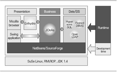 지난 달 본지에서 필자가 소개한 EJOSA(Enterprise Java Open Source Architecture)는 오픈소스 통합 배포판에 대한 직접적인 아이디어를 제공했다. EJOSA는 오픈소스만을 이용해서 구현된 J2EE 기반의 엔터프라이즈용 아키텍처이다. Enhydra와 JOnAs에서 동작하도록 설정되어 있으며, DB는 Firebiard DBMS를 사용한다. 개발 도구는 NetBeans를 추천하고 있고, 기본 프레임워크는 Velocity, AndroMDA, 세션 빈과 연동되는 Hibernate 기술을 사용하고 있다.