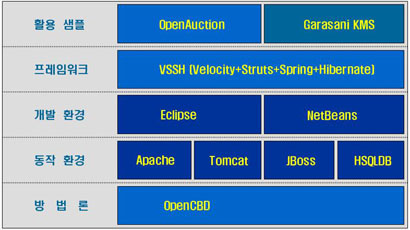 반면에 국내의 사례들은 주로 검증받은 상용 도구를 이용해서 CBD 방법론을 적용한 시스템 통합에 사용될 프레임워크에 관심이 집중되어 있음을 알 수 있다. 특히 Struts, Velocity 등의 프레임워크 통합과 관련해서는 외국에 뒤쳐지지 않은 많은 연구가 이미 진행되어 있고, 이러한 사례들이 2003년을 기점으로 폭발적으로 증가하고 있다는 사실은 기억해 둘만 하다. 이것은 자바 기반의 오픈소스 프로젝트들이 실무에 충분히 활용될 수 있을 만큼 안정화되고 있다는 걸 뜻하며, 사용 저변이 크게 확대되고 있음을 반증하는 것이기도 하다. 또한 각 기업의 발표 자료를 통해 공공, 금융, 제조를 비롯한 각종 e비즈니스 시스템 구축에 이미 다양한 오픈소스 기술들이 침투해 있다는 사실도 확인할 수 있었다. 덕분에 오픈소스 기술을 활용한 레퍼런스를 확보하는 작업이 그리 어렵지 않을 듯 하다.