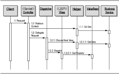 Service to Worker 패턴에서 Dispatcher는 Helper를 사용하여 뷰 역할을 수행하는 JSP로 데이터를 보낸다. 비즈니스 데이터를 자바빈즈 형태의 뷰 컴포넌트로 만들어 JSP로 넘기는 이러한 구조를 View Helper 패턴이라고 한다. Struts에서는 이러한 Helper 역할을 ActionForm이 담당하고 있다. 지금까지 설명한 Service to Worker 패턴의 동작 순서를 시퀀스 다이어그램으로 표시하면 <그림 9>와 같다.
