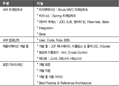 JCF의 구성에서 보듯이 JCF 역시 무게 중심은 오픈소스를 통합한 프레임워크 자체에 있다. 하지만 이클립스, Ant, JUnit, XDoclet 등의 오픈소스 도구들이 개발에 활용되고 있다는 점과 그것을 효과적으로 뒷받침하는 개발 표준 및 개발지침, 활용 경험 등이 문서화되어 가이드라인으로 제공되고 있다는 점에 주목해야 한다. 또한 프레임워크에서 Spring이 무게중심에 있다는 것도 특이한 점이다. Spring은 비즈니스 로직 처리에 강점이 많은 Struts와 같은 오픈소스 프레임워크이다. Spring 프레임워크는 3회 연재에서 자세히 다룰 것이므로 우선 Struts나 Hibernate와 같은 기존 기술과 경쟁적이지 않은 자연스러운 협력이 가능한 구조를 갖추고 있다는 것 정도만 알아두도록 하자.