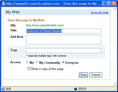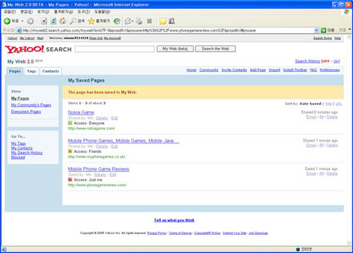 야후에서 마이웹 2.0 베타 버전을 내놓았다. 마이웹은 쉽게 말하면 사이트 태깅 및 품앗이 방식의 검색 서비스다. 정보를 찾을 때 사람이 직접 웹사이트에 붙여놓은 키워드를 중심으로 해당 사이트를 찾는 것이다.