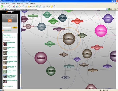 이처럼 현재는 태그 빈도수만을 단순히 폰트크기 또는 색깔로 보여주고 있지만, 향후에는 지식공학에서 흔히 예견하는 대로 정보들 간의 관계가 보다 그래피컬하게 보여질 지도 모른다. MP3.com 에서 음악끼리의 연관도를 보여주는 방식 (그림 참조)처럼, 어떤 정보를 검색하면 그 정보와 연관된 정보의 묶음이 마치 조직도처럼 디스플레이 되는 것이다.