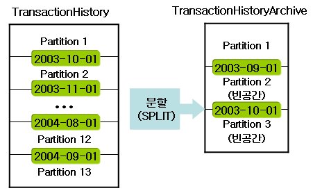 TransactionHistory에는 12개의 파티션이 있고 TransactionHistoryArchive에는 2개의 파티션이 있다. TransactionHistoryArchive는 자주 사용하지 않는 데이터를 모아 두는 곳이므로 두 개의 파티션만을 만들었다. 여기에서 TransactionHistory 테이블에서 2004년도 9월 데이터를 위한 새로운 데이터를 위한 공간을 확보하자.