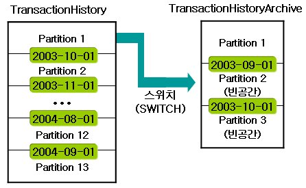 ALTER TABLE [Production].[TransactionHistory] SWITCH PARTITION 1 to [Production].[TransactionHistoryArchive] PARTITION 2;