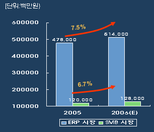 또 KRG는 2006년 국내 ERP 시장 규모가 올해보다 7.5% 성장한 5140억 원 규모가 될 것이라고 전망했다. ERP 도입이 50%를 상회하고 있지만 여전히 투자 1순위로 자리하고 있고, 특히 SMB 시장은 2006년 1280억 원 시장을 형성해 전년 대비 6.7% 성장을 예고하고 있다. 업종별로도 건설, 제약, 식음료, 조선/중공업 등 제조 업종과 공공/SOC, 서비스 업종으로 도입이 확대될 것으로 예측했다.
