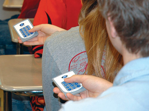 사진은 학생들이 리모컨을 이용해 선생님의 랩톱으로 퀴즈에 대한 정답을 쏘아 보내는 모습이다. 선생님들이 점점 컴퓨터와 휴대폰을 보며 자란 세대들의 눈높이를 맞추고자 노력하기 시작하면서 리모컨은 전국 수백 개의 대학과 대학교들에서 교육 도구로 등장하고 있다.
