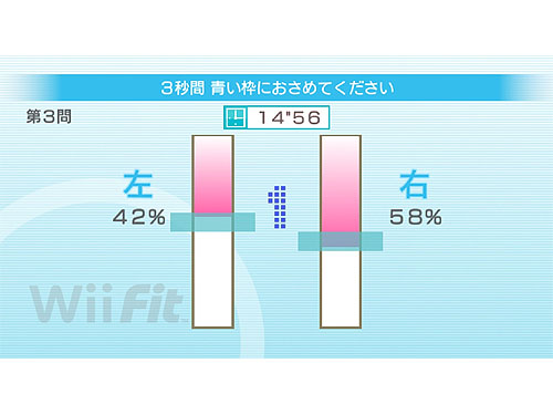 그리고 나서는 간단한 균형감각 테스트를 실시한 후 위핏 나이(Wii Fit Age)를 스크린에 커다란 숫자로 보여준다(일반적으로 제한된 시간 내에 특정 공간에서 균형감각 유지).