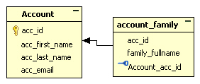 <그림 1>은 이제부터 살펴볼 기본적인 CRUD 작업에 사용된 테이블의 구조다. 계정(account) 정보와 그 계정의 가족 정보(account_family)를 가지는 지극히 간단한 구조로 되어 있다. 하지만 여기서 살펴볼 아이바티스의 기능을 구현하기에는 더없이 적절한 구조라고 생각된다.