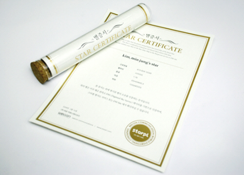 이번 이벤트를 통해 주어지는 별 증서는 자신의 별 정보와 그 별을 소유한 주인의 이름이 인쇄된 인증서다. 실제로 존재하는 별이기 때문에 고유한 좌표와 등급 정보가 등이 새겨져있는 것은 물론 금장으로 만들어져 유리병 속에 담겨 소장 가치를 높이고 있다. 물론 이 증서가 법적으로 실제 별에 대한 소유권을 인정하는 것은 아니다.