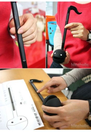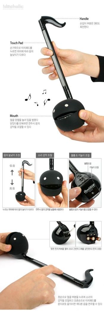 최근 테르민, 스타일로폰 등 초기 전자음향기기를 흉내 낸 제품들이 종종 눈에 띄는데 오늘 소개할 Otamatone도 그러한 전자기기와 비슷한 제품이라고 할 수 있다. 악보에 빼곡히 그려져 있는 콩나물을 이용한 재미있는 악기이다. 그런데 충분히 귀엽게 만들 수도 있었을 것 같은데 역시나 그들의 특기인 엽기적인 형태를 버리지 않았다. 최면에 걸린 콩나물 같기도 하고 콩나물을 닮은 올챙이 귀신 같기도 하다.