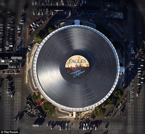 더 포럼에 이 같은 거대 레코드판이 설치된 것은 바로 캘리포니아 출신의 세계적 밴드 이글스(The Eagles) 공연 홍보 때문이다. 거대 레코드판 역시 이글스의 대표 앨범 '호텔 캘리포니아'(Hotel California)로 만들어졌다.