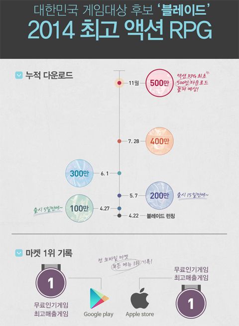 국내 최초 언리얼3엔진으로 개발된 모바일 액션 RPG 블레이드는 현존 최고의 그래픽과 뛰어난 액션, 타격감, 게임성으로 이용자의 선택을 받으며 출시 6개월 만에 500만 다운로드 돌파를 앞두고 있다. 또, 지난 4월 22일 출시 이후 누적 매출 900억을 돌파, 곧 1천억 고지를 눈앞에 두고 있는 상태다. 이 기록은 올해 출시된 국산 모바일 RPG 중 단일 시장 최대 매출이다.