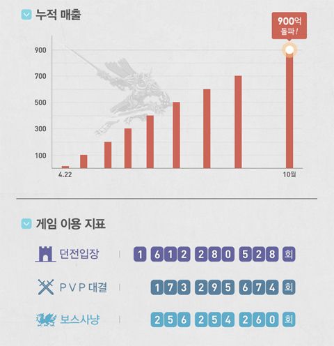 블레이드를 즐긴 유저들은 6개월간 던전에 약 16억 회 입장했으며, PVP는 1억 7천만 회를 즐겼다. 보스 몬스터는 무려 2억 5천만 회 사냥 당한 모습.김재영 액션스퀘어 대표는 블레이드가 매출 900억, 다운로드 500만 돌파라는 대기록을 세울 수 있었던 것은 모두 이용자 여러분의 사랑과 관심 덕분이라고 생각한다. 앞으로도 유저 여러분의 사랑에 보답할 수 있는 개발사가 되도록 온힘을 기울이겠다고 전했다.