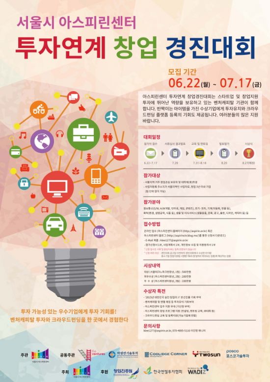 서울시 아스피린센터(센터장 이선호)는 더 벤처스, 마젤란기술투자, 쿨리지코너인베스트먼트, 투썬인베스트, 포스코기술투자와 공동으로 서울지역 창업활성화, 우수 사업 모델 및 기업발굴을 위한 ‘아스피린센터 투자연계 창업 경진대회’를 개최한다고 1일 밝혔다.
