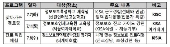 구체적으로 7일에는 KISA 산하 인터넷침해대응센터(KISC)에 근무 중인 보안전문가가 직접 정보보호 특성화고등학교인 선린인터넷고를 찾아가 사이버 침해 동향에 대한 특강을 실시한다. 오는 8일 정보보호의 날 기념식이 열리는 서울 양재동 더케이호텔에서 정보보호 업체 30곳이 참여한 가운데 인력채용박람회가 열린다.