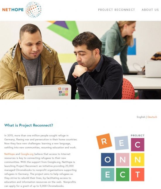 27일 씨넷에 따르면 구글은 독일로 도망온 시리아 난민의 정보 수집과 학습 재개 등을 지원하고자 비영리 단체 넷호프(NetHope)와 공동으로 난민에 크롬북 2만5천대를 제공하는 ‘프로젝트 리커넥트’를 시작했다. 이를 위해 구글은 자선 활동 부문인 구글.org를 통해 530만 달러를 기부한다.