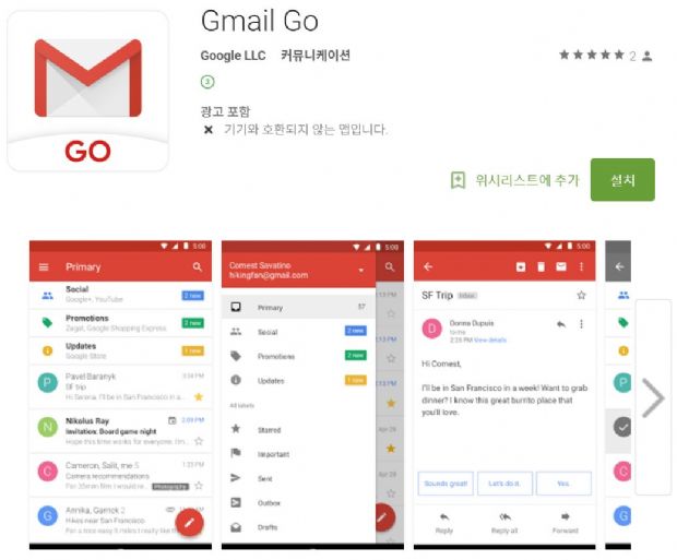 G메일 Go 앱은 기존 G메일 앱보다 가볍고 빠르다. 동시에 스마트폰의 컴퓨팅 자원은 덜 사용하는 점이 특징이다.