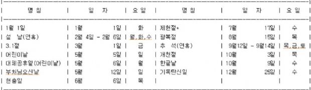 주 5일제를 실시하는 기관의 경우 52일의 토요일이 더해져 118일의 휴일이 생기지만, 추석 연휴가 토요일과 겹쳐 실제 휴일 수는 117일로 올해보다 2일 줄어든다.