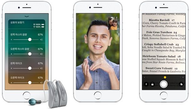청각 장애인을 위해서는 아이폰 전용 보청기와 아이폰을 활용해 주변 소음이 심한 공간에서도 상대방의 말을 더 명확하게 들을 수 있도록 해주는 ‘실시간 듣기’ 기능이 탑재됐다. 원하는 쪽 귀에 소리가 더 크게 들리도록 하는 모노 오디오를 지원하며 새로운 연락이나 알림 등을 놓치지 않도록 눈으로 보여주고 진동을 통해 인식하도록 한다.