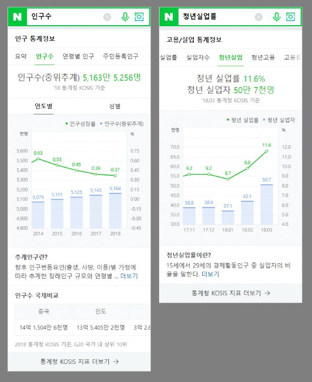 예를 들어, 네이버 모바일 검색창에 '인구수', '청년실업률', '수출액' 등과 같은 키워드를 입력하면 이에 해당하는 수치뿐만 아니라, 키워드에 따라 년도/월별 추이 그래프, 연령별 지표, 시도별 지표, G20국제 지표까지 한번에 확인할 수 있다.