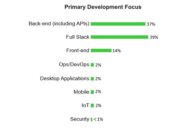 북미 지역에선 노드.js를 풀스택 개발에 이용하는 경향이 더 강하게 나타났다. 북미 응답자 중 42%가 풀스택에, 32%가 벡엔드에 사용한다고 답했다.