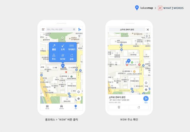 카카오(공동대표 여민수·조수용)는 모바일 지도 서비스 ‘카카오맵'을 업데이트하면서 이같은 내용의 정밀 지도 서비스 'W3W' 기능을 제공한다고 2일 밝혔다.